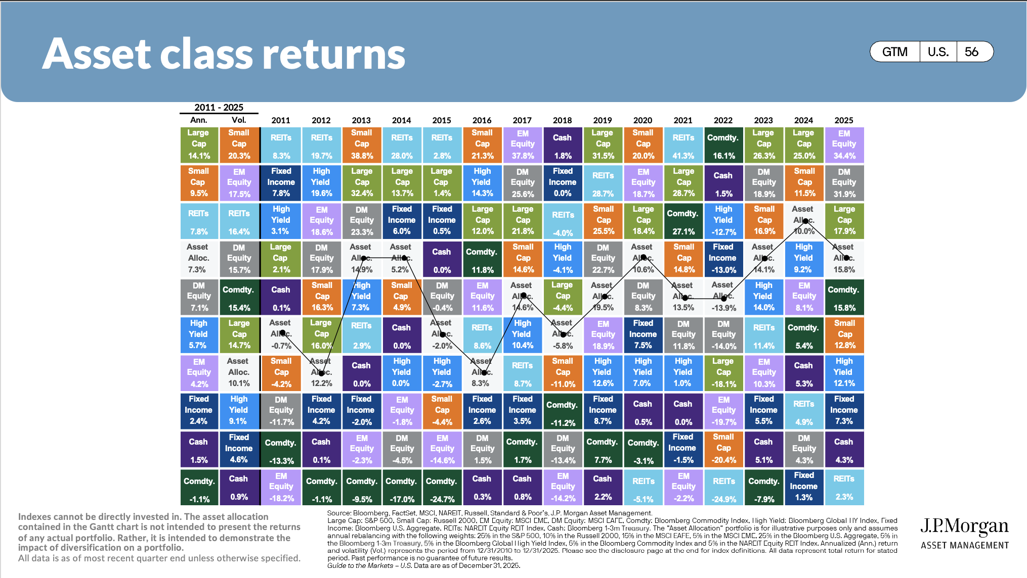 It’s tempting to chase whatever investment is winning right now, but this quilt shows why that rarely works. Each row is a different year. Each column is a different type of investment. The colors jump all over the place.