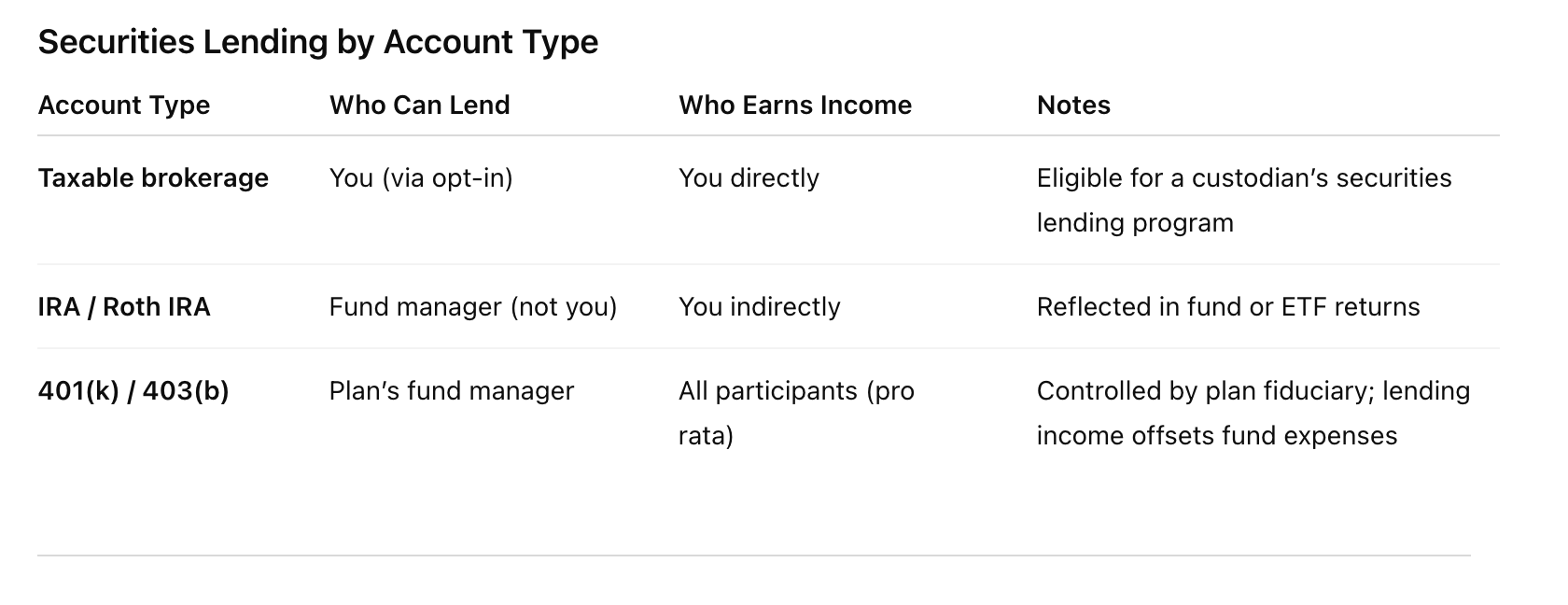 If you hold these positions inside an IRA or 401(k), securities lending can make sense. Taxes aren’t a factor there, and you’re already investing for long-term growth. That said, dissapointly it’s not typically offered on these types of accounts for individual investors.